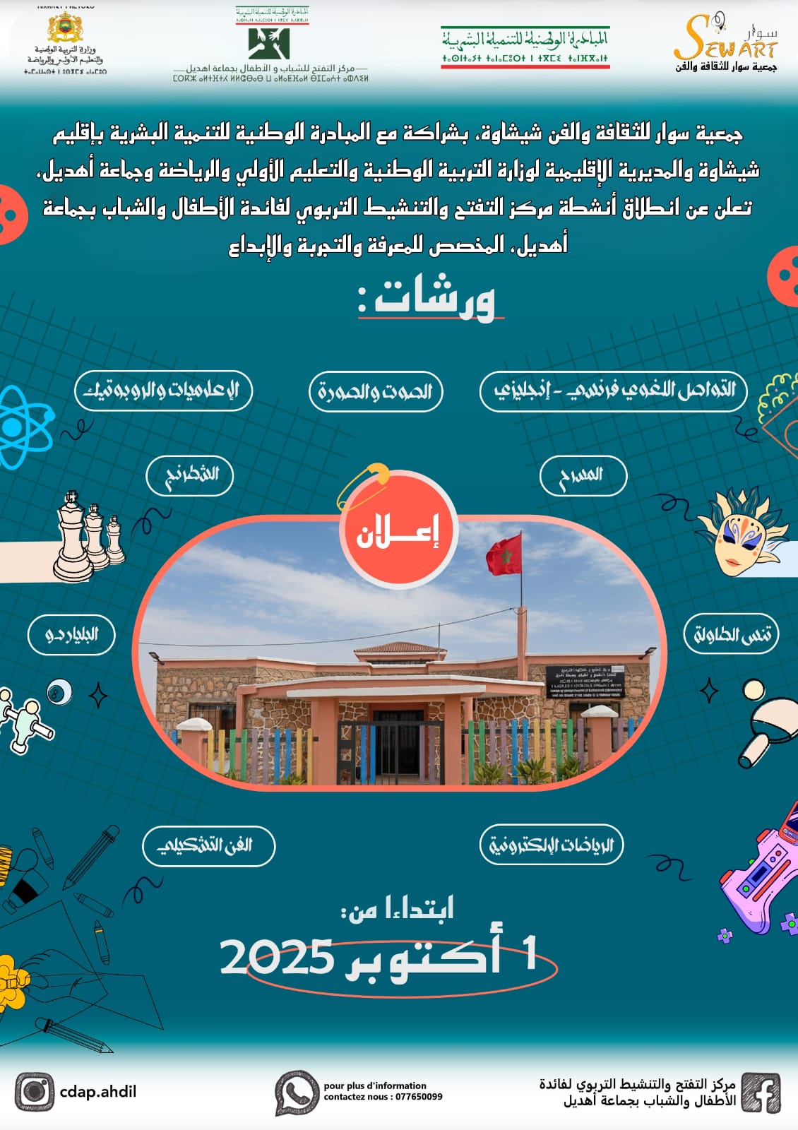 في إطار تعزيز العرض التربوي والثقافي الموجه للأطفال والشباب، تعلن جمعية سوار للثقافة والفن بشيشاوة، بشراكة مع المبادرة الوطنية للتنمية البشرية بإقليم شيشاوة والمديرية الإقليمية لوزارة التربية الوطنية والتعليم الأولي والرياضة وجماعة أهديل، عن انطلاق التسجيل للاستفادة من خدمات مركز التفتح والتنشيط التربوي بجماعة أهديل، ابتداءً من يوم الاثنين الاربعاء 01 أكتوبر 2025.